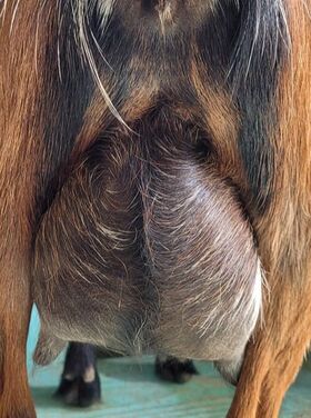 Kya is a 2nd freshener from my Sun Catcher T Pequot line, and was a keeper from the beginning. She has that soft pliable skin that I know this line for, with a lovely udder texture, and is easy to milk. She was milked as a first freshener, and we had no problems training her to the stand. She kidded easily both times. We ended up letting her dam raise this year, and she was a great mom, but she went right back to being milked when we weaned the baby. She is dry now. She’s a hard one for me to let go, but I have so many from that line, including her daughter from last year.