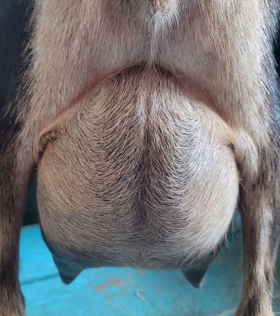 Ginger was not planned to be kept, but her calm and sweet personality won us over. She’s one of my sister’s goats, though, and with her moving out, Ginger needs to find a new home. As a first freshener she trained to being milked very easily, both by machine, and by hand. Good attachments all around, and though she wasn’t super productive, she was within what I expect my first fresheners to do. As a 3rd freshener I am pleased with how she has continued to improve. Her sire has earned his +B from his daughters, and with the LA scores from both sides of her pedigree I think she will be a positive addition to any herd.