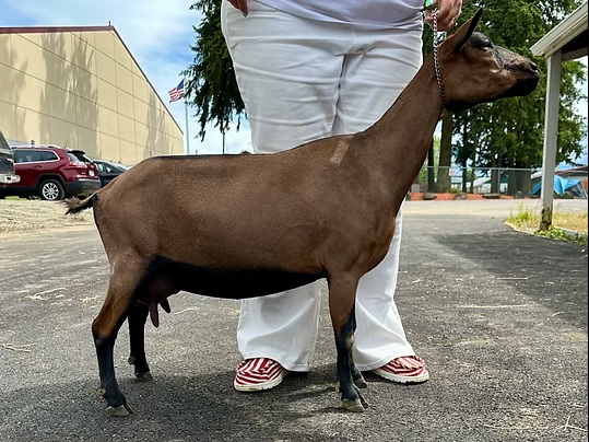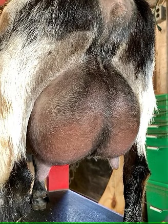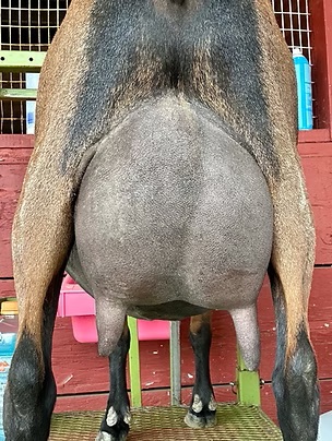 I periodically bring in new bucks for some new blood, and oh my goodness, am I excited about this guy. He goes back to several Old Mountain Farm animals that I have been obsessed with for years. Most especially Old Mountain Farm Stag on both sides of his pedigree. I love how long and level he is, with good width. His dam has good capacity, with nice long teats. She has been on test, and milked enough on her first lactation to earn her milk star, if ADGA ever gets around to awarding it, so he should have his *B. I can’t wait to see what he can do for us here.