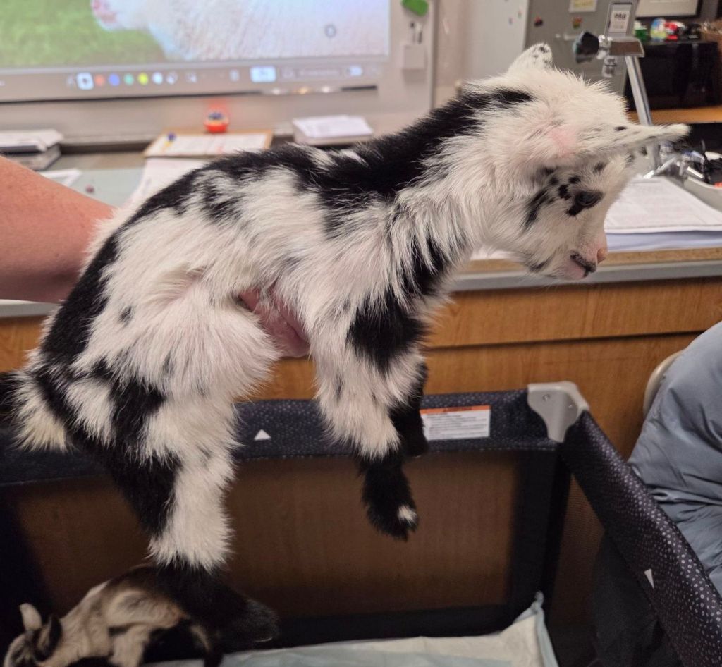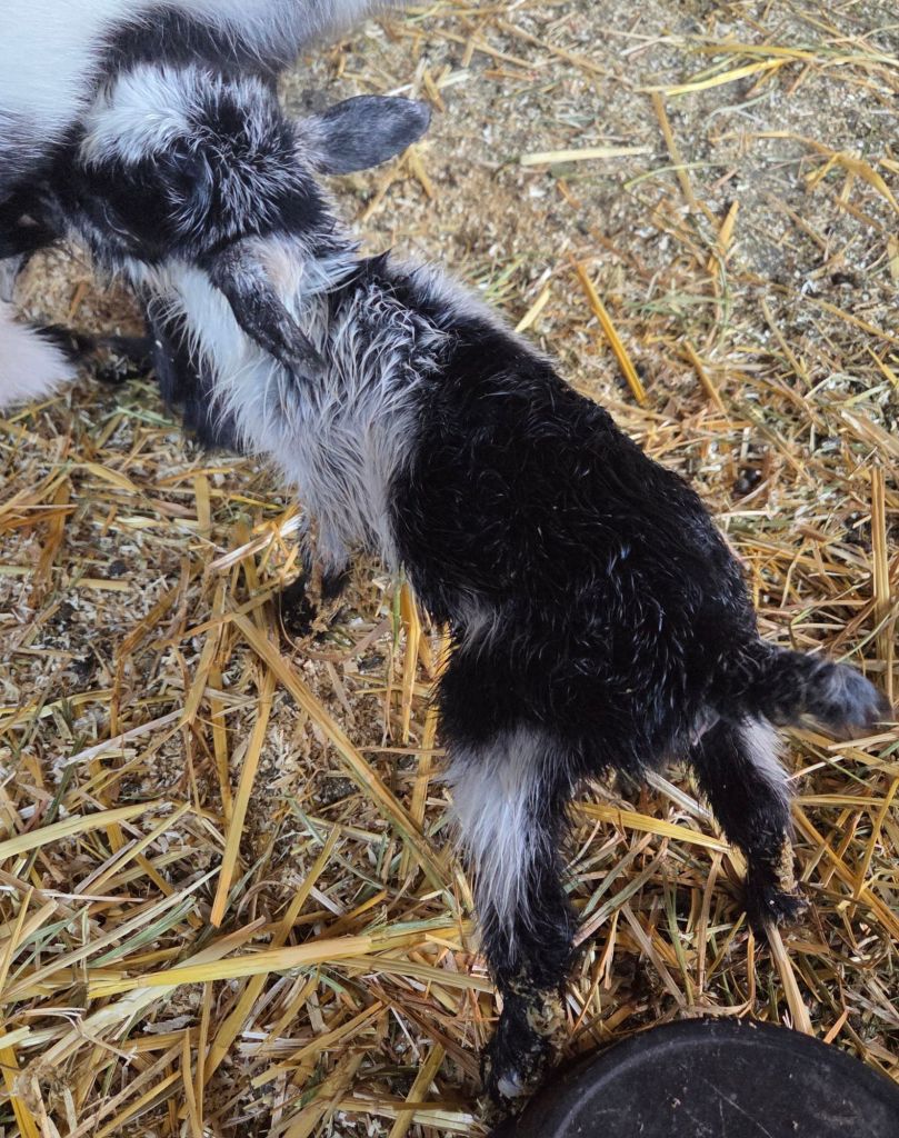 Toddy is an old pro at having babies. I checked on her when I got home from work, and she had no ligaments, and was talking a lot. (Not unusual for her to talk, but it was different from her normal.) We got her moved to the barn, and I went in the house to change into barn clothes. When I got back to the barn, she was laying down, and starting to push. Baby 1 popped out as I was getting my gloves on, and babies 2 and 3 followed quickly after. No pulling required, just catch, clear the face, and move in front of mom. The girl was really struggling figuring out eating, so after 24 hours of assisting, we just took her to be a bottle baby, and she’s doing really well. Both boys are strong, and Toddy is taking great care of them.